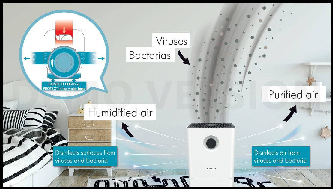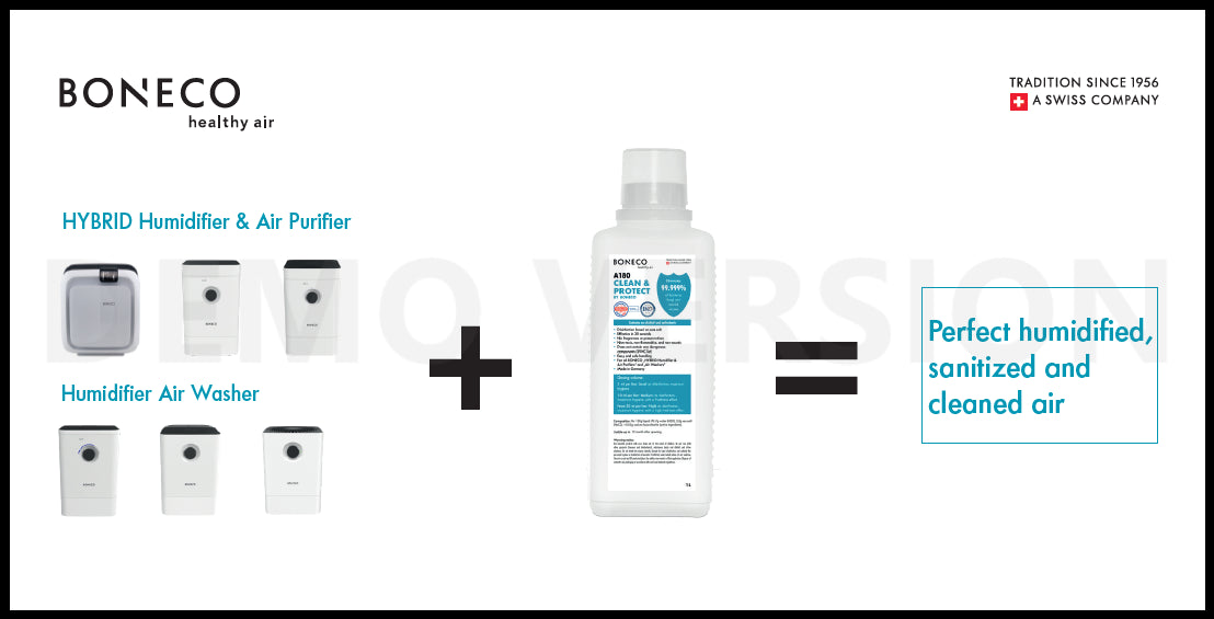 Aparatele BONECO din categoria HYBRID (Modelele H680, H400 si H300), precum și cele din categoria AIR WASHER (Modelele W200, W300 si W400) împreună cu soluția A180-CLEAN & PROTECT, dezinfectează aerul și îl umidifică.