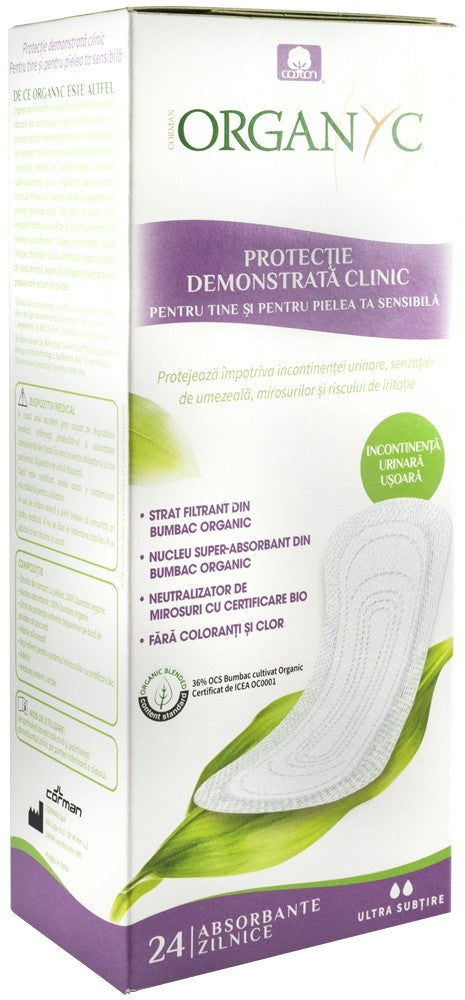 Organyc Incontinență urinară ușoară vă oferă beneficiile naturale ale bumbacului organic certificat pentru o protecție deplină împotriva pierderilor de urină, senzației de umezeală, mirosurilor și riscului de iritație. Datorită compoziției speciale din bumbac organic, molecule super-absorbante și un ingredient specific pentru controlul mirosurilor, Organyc vă oferă siguranța unei protecții dovedite clinic, fără griji.