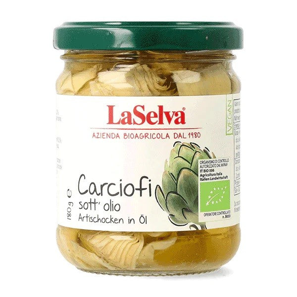 Bucăți delicate de anghinare albite în apă și oțet și conservate în ulei de floarea soarelui și ulei de măsline extravirgin. Anghinarele noastre organice în ulei sunt: moi, proaspete și aroma lor elegantă este îmbunătățită printr-o procesare atentă.