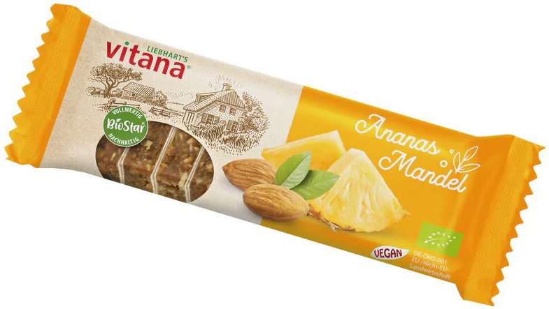 Ingrediente: bucăți de ananas* uscate 31%, curmale* uscate, migdale* 19%, suc de ananas concentrat* 14%, napolitană* (făină de grâu*, amidon de cartofi*), ulei de floarea soarelui*, amidon de porumb*, sare de mare.