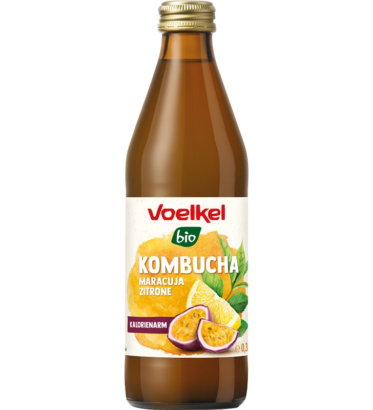 Băutură fermentată ecologică de ceai, carbogazoasă, fructul pasiunii și suc de lămâie.