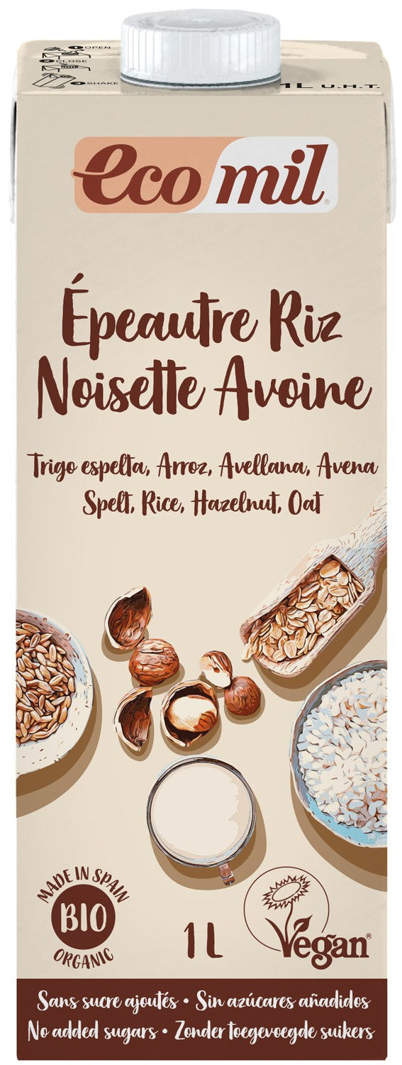 Ingrediente: apă, grâu spelta* (7%), orez* (6%), piure de alune* (3%), ovăz* (2%), ulei de floarea soarelui presat la rece*, sare de mare, agent de îngroșare: făină de roșcove*.