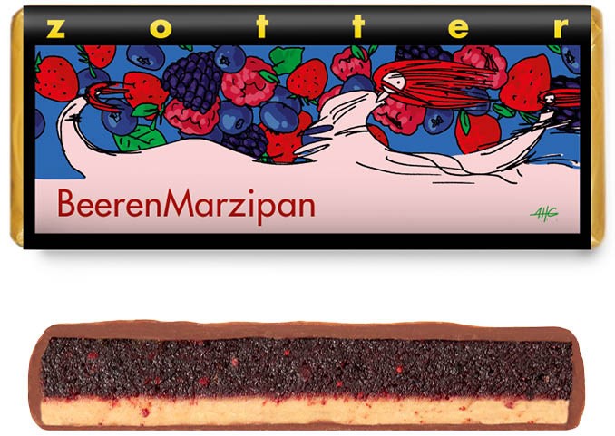 Ciocolată cu lapte alpin° umplută cu cremă de marzipan cu fructe de pădure (40%) și nuga° cu migdale (18%).