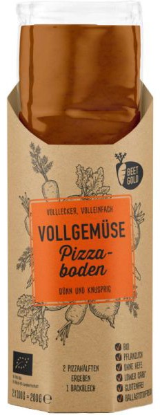 Blat de pizza pe baza de tescovină de morcovi și sfecla rosie, precoaptă, gata de servit.