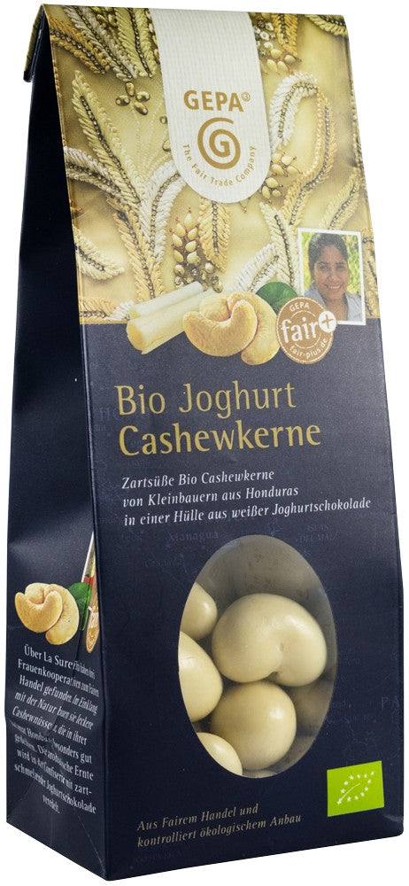 Nuci caju ecologice fragede de la micii fermieri din Honduras în glazură de ciocolată albă cu iaurt.
