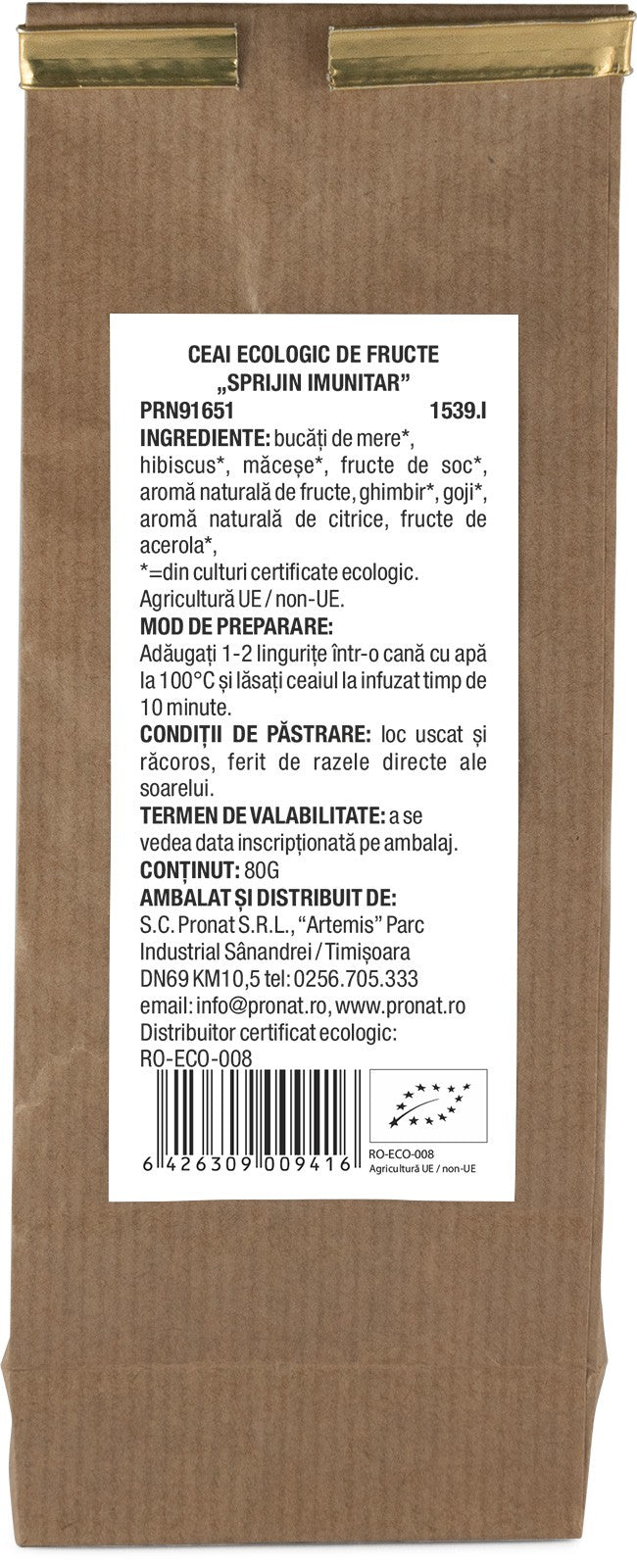INGREDIENTE: bucăți de mere*, hibiscus*, măceșe*, fructe de soc*, aromă naturală de fructe, ghimbir*, goji*, aromă naturală de citrice, fructe de acerola*,