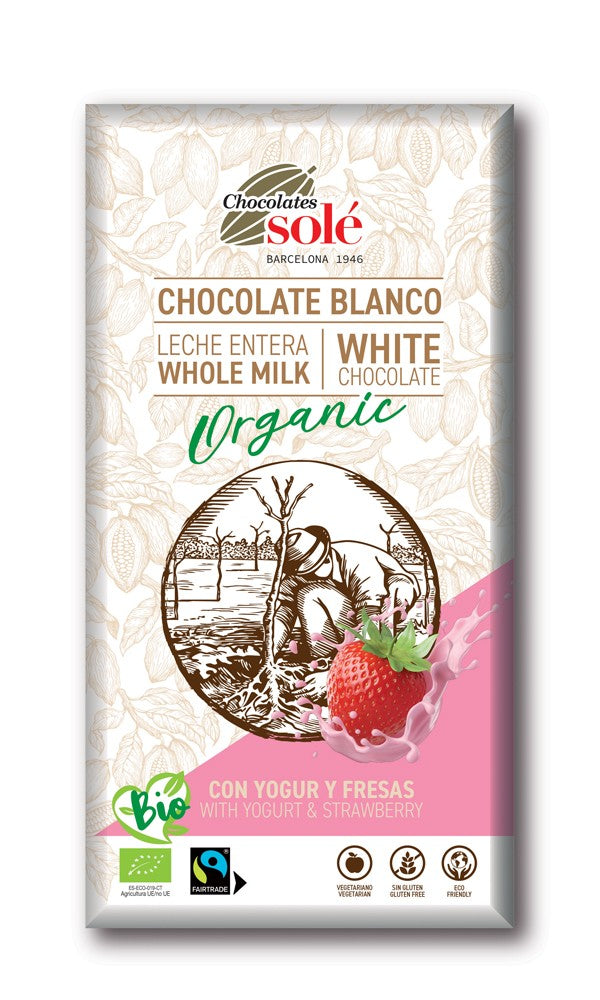 Ciocolată albă fină, cu gust rafinat de iaurt şi căpşuni delicioase, din ingrediente 100% BIO!