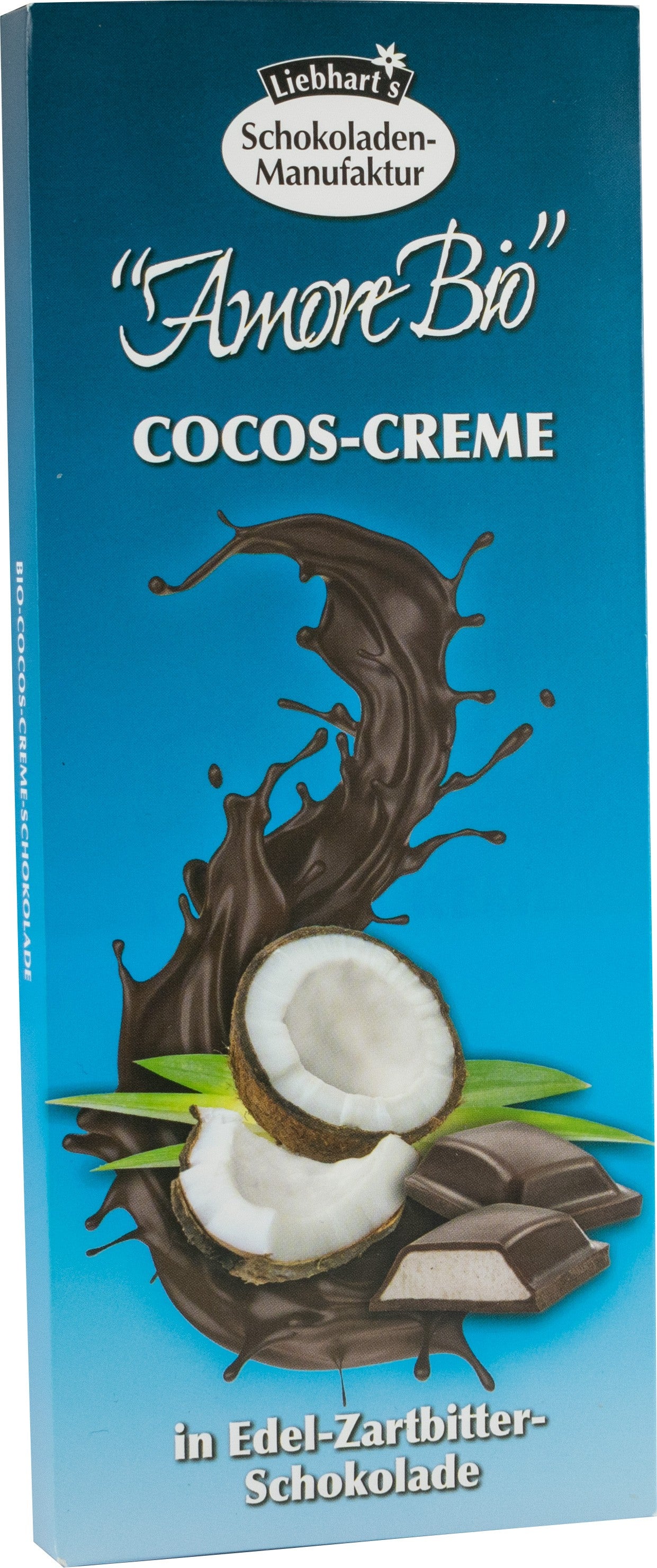 Ciocolată neagră 55% ecologică cu umplutură de cremă de cocos 45% . Nu conține gluten.