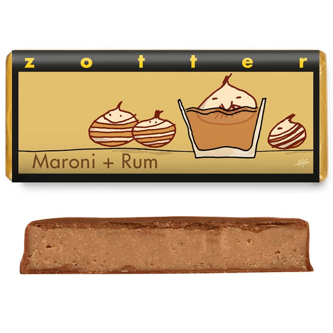 Ingrediente: zahăr integral din trestie°, unt de cacao°, piure de castane°, lapte praf integral°, pulbere de castane°, masă de cacao°, lapte praf degresat°, rom°, miere°, sirop de orez°, amaretto°, alune de pădure°, pulbere de zer dulce°, zahăr brut integral°, emulgator: lecitină (soia)°, pulbere de păstăi de vanilie°, sare de stâncă, ulei de migdale amare°, scorțișoară°.