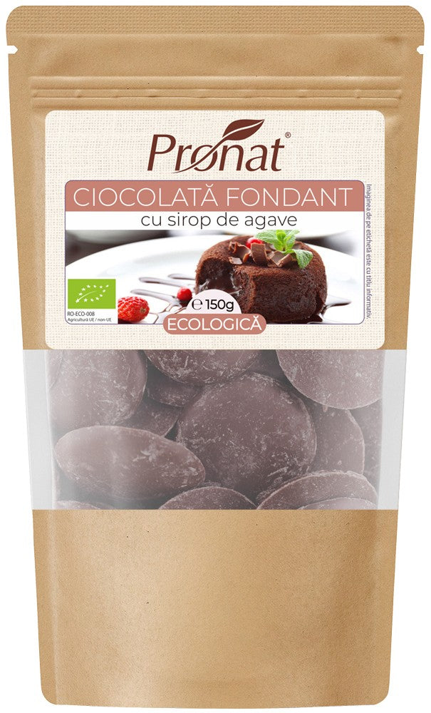 Ciocolată fondant ecologică în formă de bănuți, conținut de cacao minim 60%.