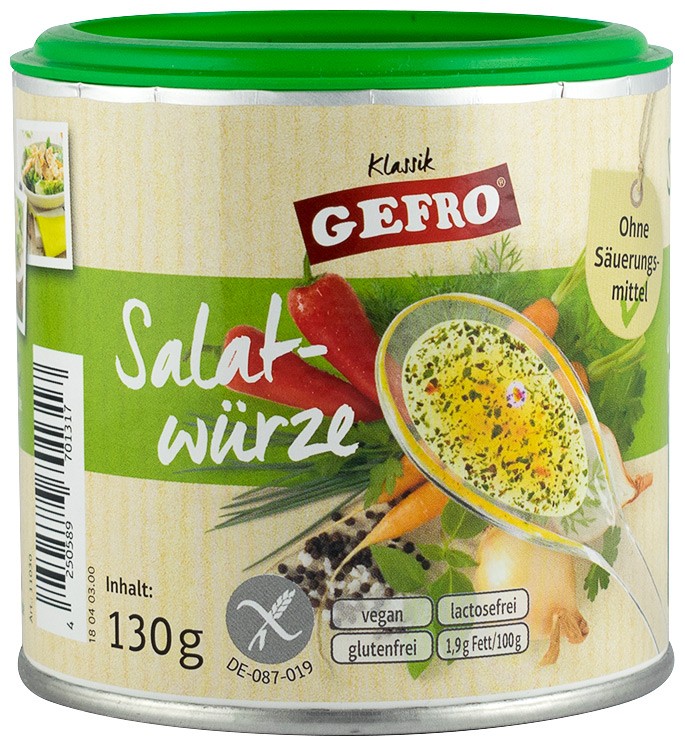Mod de preparare: Folosiți oțet, ulei și apă ca de obicei și adăugați GEFRO condiment pentru salată pentru a adăuga aroma. Variații cu ierburi proaspete, ceapă, smântână sau iaurt.
