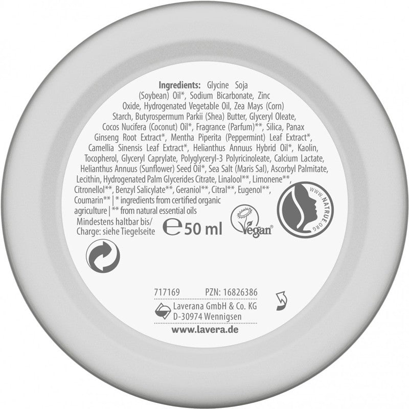 INGREDIENTE: ulei de soia*, bicarbonat de sodiu, oxid de Zinc, ulei vegetal hidrogenat, amidon de porumb, unt de shea (Butyrospermum Parkii), Gliceril Oleat, ulei de cocos (Cocos Nucifera)*, Parfum (Fragrance)**, Silice, extract din rădăcină de ginseng*, extract din frunze de mentă (Mentha Piperita)*, extract din frunze de plantă de ceai (Camellia Sinensis)*, ulei hibrid de floarea soarelui (Helianthus Annuus)*, Caolin, Tocoferol, Caprilat de gliceril, Polyglyceryl-3 Polyricinoleate, Lactat de calciu, ulei din semințe de floarea soarelui (Helianthus Annuus)*, sare de mare (Maris Sal), Palmitat de ascorbil, Lecitină, Citrat de gliceride de palmier hidrogenate, Linalool**, Limonene**, Citronellol**, Salicilat de benzil**, Geraniol**, Citral**, Eugenol**, Cumarină**.