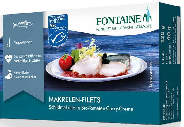 Ingrediente: file de macrou fără piele (Scomber scombrus) 60%, pastă de roșii*, (19%), ulei de floarea soarelui*, apă, zahăr integral de trestie*, curry* (1,7%), oțet de vinars*, suc de lămâie*, sare de mare, agent de îngroșare: gumă de guar*.