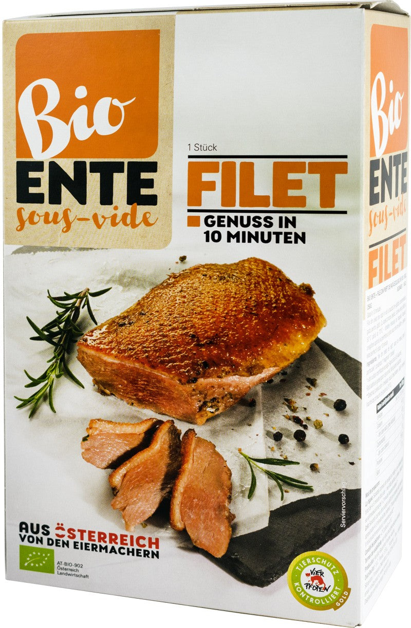 File din piept de rață în vid (a bucată pre-gătită) condimentată, gata pentru gătit. Cu acest proces delicat, carnea este gătită la 50°C până la 70°C - rămâne minunat de fragedă. Această pregătire optimă vă permite un timp scurt de pre-gătire – pieptul este perfect în doar 10 minute.