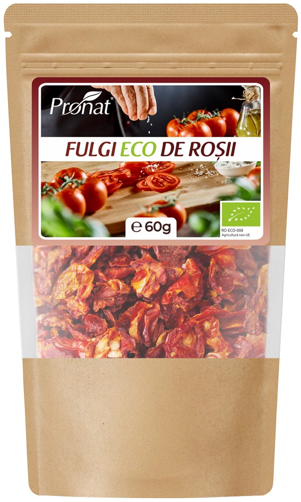 SUGESTII DE UTILIZARE: pot fi adăugate cu succes în supe și salate, în sosuri și dressing-uri, ideale pentru tocănite. Merg foarte bine cu ulei de măsline și usturoi pentru un spread. Amestecați fulgii de roșii uscate în preparatele din bucătăria italiană precum bruschete, caprese, pesto, paste sau uleiuri.