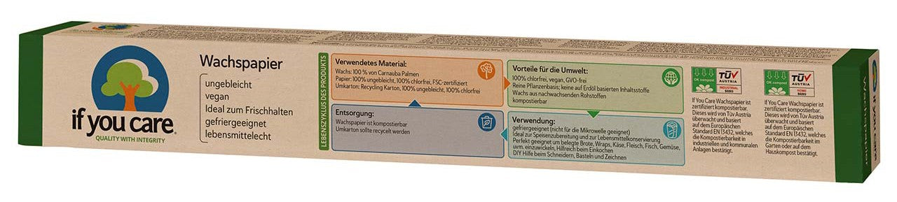 Această hârtie cerată versatilă, înlocuiește folia alimentară și folia de aluminiu! În plus față de ceara 100% vegană obținută din palmieri de carnauba, materialul folosit este hârtie certificată FSC, nealbită și fără clor. Hârtia, care poate fi utilizată de mai multe ori pe ambele părți, este impermeabilă, rezistentă la grăsimi, respirabilă, inodoră și insipidă.