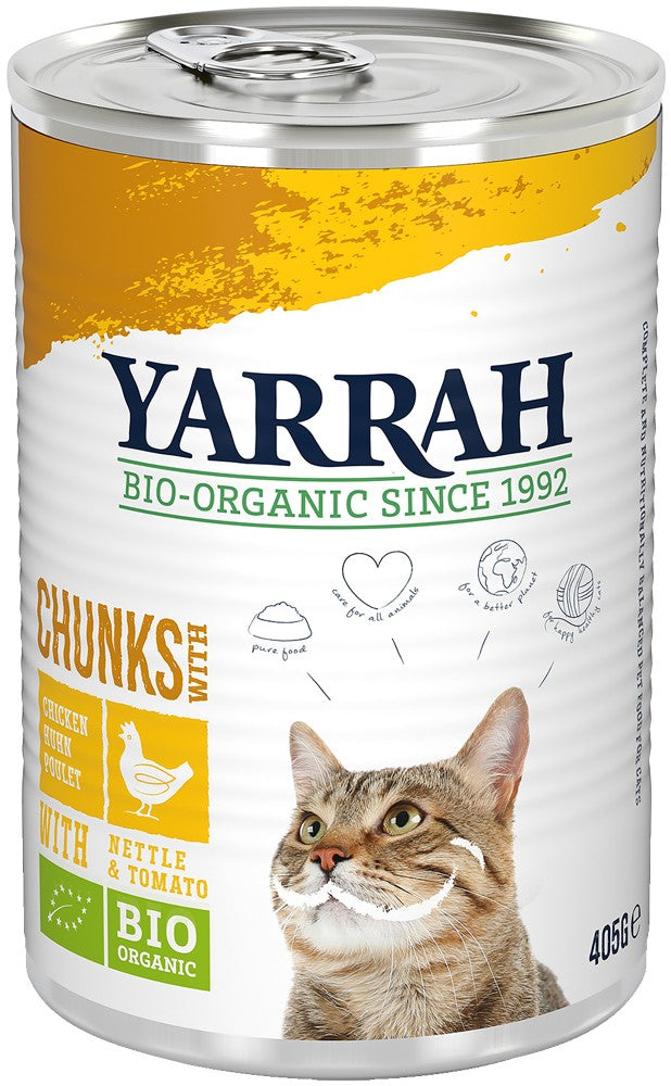 Bucăți gustoase cu pui bio suplimentate cu urzică și roșii certificate ecologic. Hrana organică umedă este o masă completă, hrănitoare și foarte gustoasă pentru pisica ta. Furaj organic pur și, prin urmare, fără arome chimice adăugate, coloranți și arome, pesticide și OMG, prin care au fost selectate cele mai bune proteine absorbabile. În acest fel, pisica ta primește exact ceea ce are nevoie. Bucățile mici sunt ușor de mâncat. Aromele cărnii au fost absorbite în sos, făcând mâncarea umedă să aibă un gust și mai bun. Yarrah recomandă hrană umedă pentru fiecare pisică. Hrana umedă are un conținut ridicat de umiditate și ajută pisica să rămână hidratată. Pisicile mai în vârstă și pisicile care beau puțină apă beneficiază în special de o porție zilnică de hrană umedă.