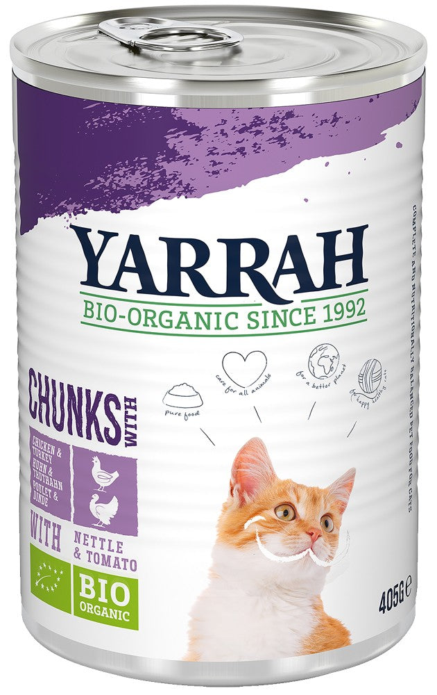 Bucăți gustoase cu pui și curcan bio suplimentate cu urzică și roșii certificate ecologic. Hrana organică umedă este o masă completă, hrănitoare și foarte gustoasă pentru pisica ta. Furaj organic pur și, prin urmare, fără arome chimice adăugate, coloranți și arome, pesticide și OMG, prin care au fost selectate cele mai bune proteine absorbabile. În acest fel, pisica ta primește exact ceea ce are nevoie. Bucățile mici sunt ușor de mâncat. Aromele cărnii au fost absorbite în sos, făcând mâncarea umedă să aibă un gust și mai bun. Yarrah recomandă hrană umedă pentru fiecare pisică. Hrana umedă are un conținut ridicat de umiditate și ajută pisica să rămână hidratată. Pisicile mai în vârstă și pisicile care beau puțină apă beneficiază în special de o porție zilnică de hrană umedă.