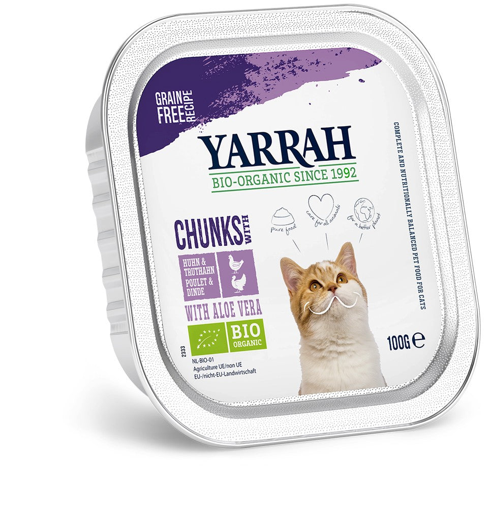 Bucăți fără cereale cu pui și curcan bio, suplimentate cu aloe vera certificată ecologic. Hrana organică umedă este o masă completă, hrănitoare și foarte gustoasă pentru pisica ta. Furaj organic pur și, prin urmare, fără arome chimice adăugate, coloranți și arome, pesticide și OMG, prin care au fost selectate cele mai bune proteine absorbabile. În acest fel, pisica ta primește exact ceea ce are nevoie. Bucățile mici sunt ușor de mâncat. Aromele cărnii au fost absorbite în sos, făcând mâncarea umedă să aibă un gust și mai bun. Yarrah recomandă hrană umedă pentru fiecare pisică. Hrana umedă are un conținut ridicat de umiditate și ajută pisica să rămână hidratată. Pisicile mai în vârstă și pisicile care beau puțină apă beneficiază în special de o porție zilnică de hrană umedă.
