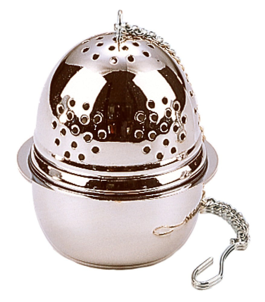 Infuzor de ceai sub forma de ou cu tavita din otel inoxidabil.