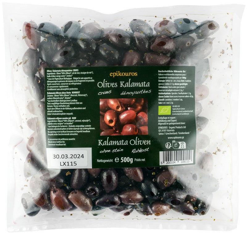 Măslinele Kalamata fără sâmburi, uleioase, cu ierburi aromatice.
