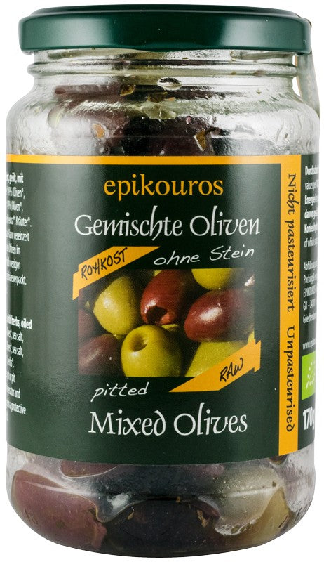 Măslinele verzi și kalamata fără sâmburi, uleioase, cu ierburi aromatice.