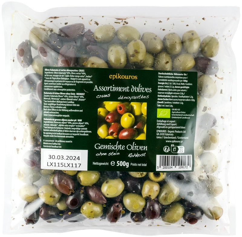 Măslinele verzi și kalamata fără sâmburi, uleioase, cu ierburi aromatice.