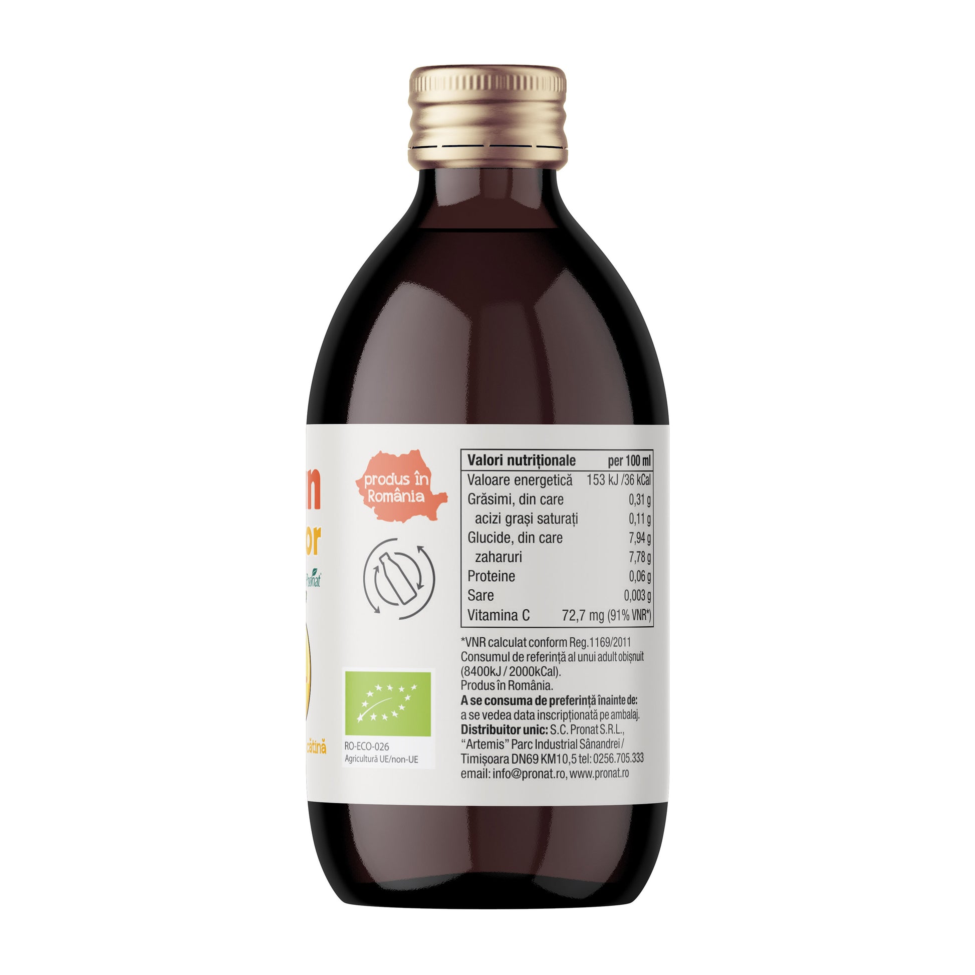 Apa, suc ecologic de lamaie 25%, suc presat la rece de catina BIO 10%, sirop de agave ecologic 10%.