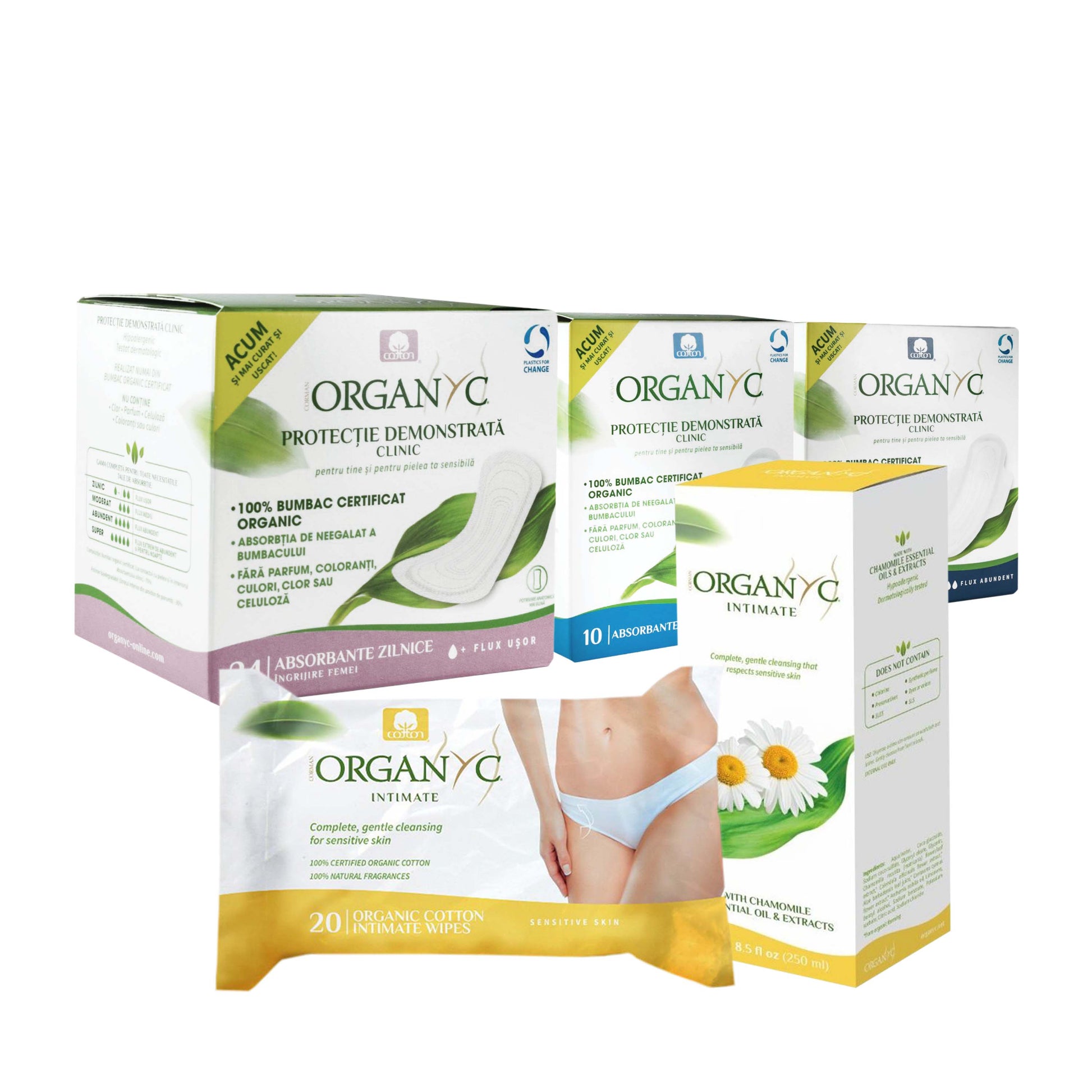 Reunește produsele esențiale Organyc, realizate din 100% bumbac organic certificat, special concepute pentru pielea sensibilă și pentru menținerea echilibrului natural al zonei intime. Acestea sunt singurele absorbante din bumbac organic dovedite clinic ca având un efect de reducere a efectelor neplăcute asociate cu folosirea de absorbante sintetice sau de calitate îndoielnică.