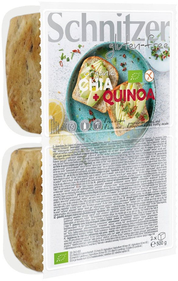 Ingrediente: apă, amidon de porumb*, aluat natural de orez* (făină de orez*, apă), 9% făină integrală de quinoa*, 4% semințe de chia*, seminșe de dovleac*, susan*, ulei de floarea soarelui*, făină de porumb*, făină de orez*, semințe de floarea soarelui*, tărâțe de psyllium*, făină din semințe de in*, proteină de mazăre*, dextroză*, sare de mare, drojdie*, agent de îngroșare: gumă de guar*, gumă de xantan, mirodenii*.