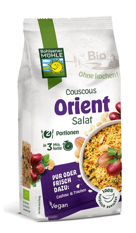 Amestecați Salata Orientală de Couscous cu 250 ml de apă într-un recipient potrivit și lăsați-o să se hidrateze timp de trei minute. Condimentele orientale se potrivesc de minune cu struguri proaspeți și caju.