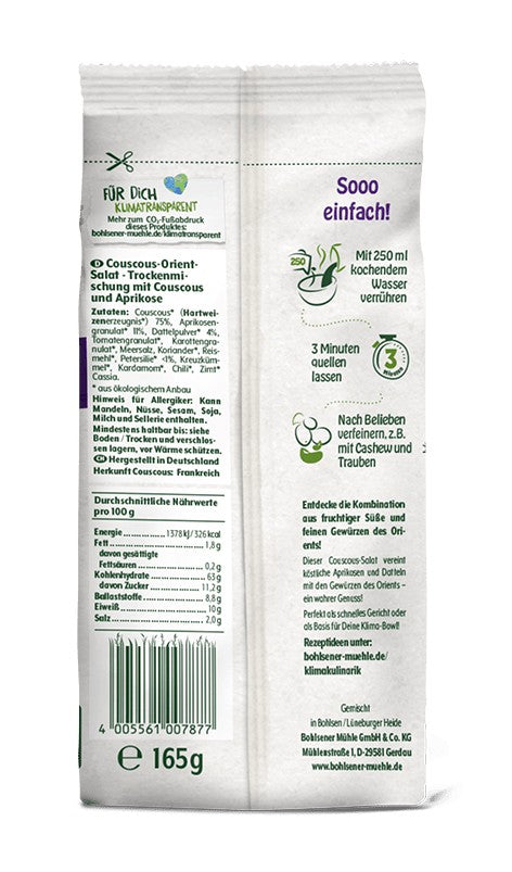 Ingrediente: couscous* (produs din grâu dur*) 75%, granule de caise* 11%, pudră de curmale* 4%, granule de roșii*, granule de morcov*, sare de mare, coriandru*, făină de orez*, pătrunjel* <1%, chimion*, cardamom*, chili*, scorțișoară*, scorțișoară cassia*.