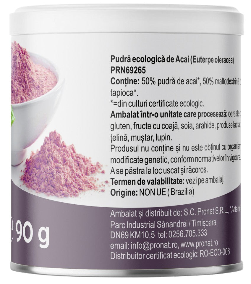 Conține: 50%% pudră de acai*, 50%maltodextrină de tapioca*.