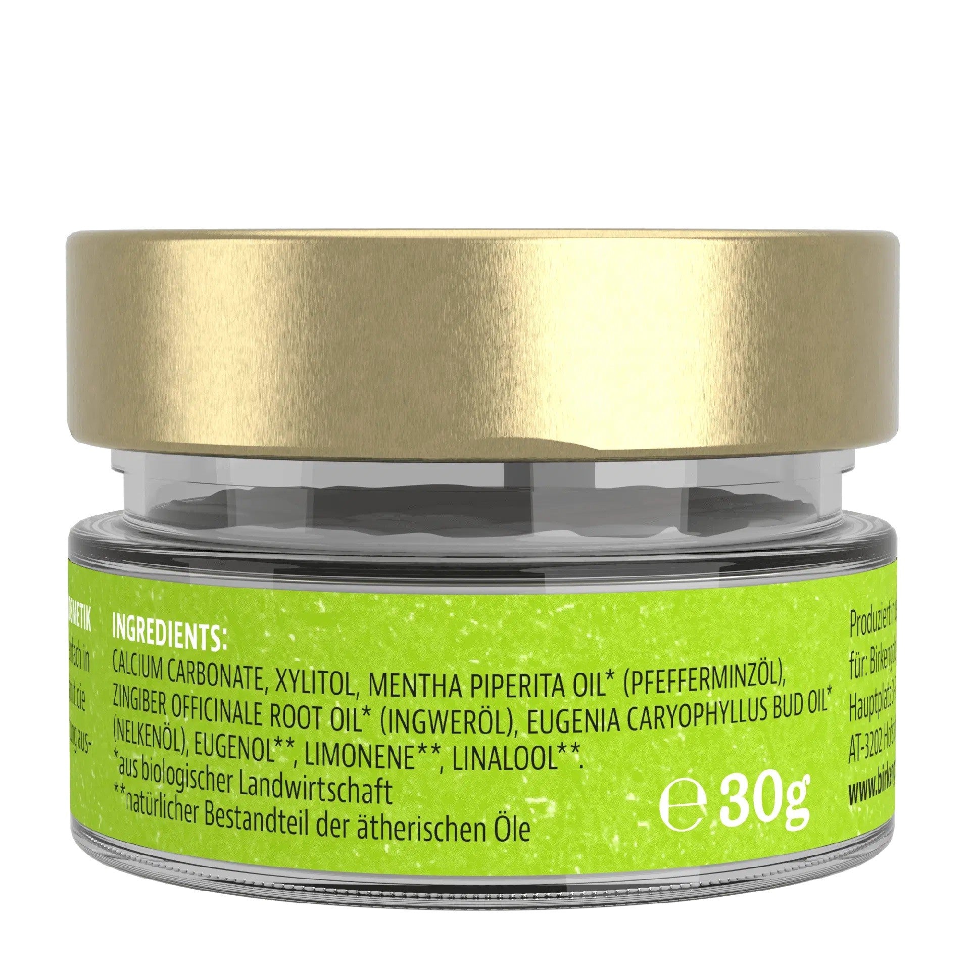 Ingrediente: carbonat de calciu, xylitol, ulei de mentă* (Mentha piperita), ulei din rădăcină de ghimbir* (Zingiber officinale root), ulei de cuișoare* (Eugenia caryophyllus bud), Eugenol**, Limonene**, Linalool**.