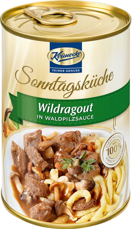 Ingrediente: apă, carne de cerb* (44%), ceapă (8%), amestec de ciuperci de pădure (5%) (Champignons, Turta vacii, Boletul granulat, Râșcov, în proporții variabile), amidon de grâu modificat, ulei de rapiță, făină de grâu, vin roșu, pastă de roșii, sare de masă iodată (sare de masă, iodat de potasiu), zahăr, condimente (conțin țelină), extracte de condimente, pudră de zer îmbogățit cu proteine, agent de îngroșare: gumă de guar, lapte praf degresat, zahăr caramelizat, ulei de floarea soarelui, ulei de palmier, lactoză, dextroză, arome (conține ou si țelină).