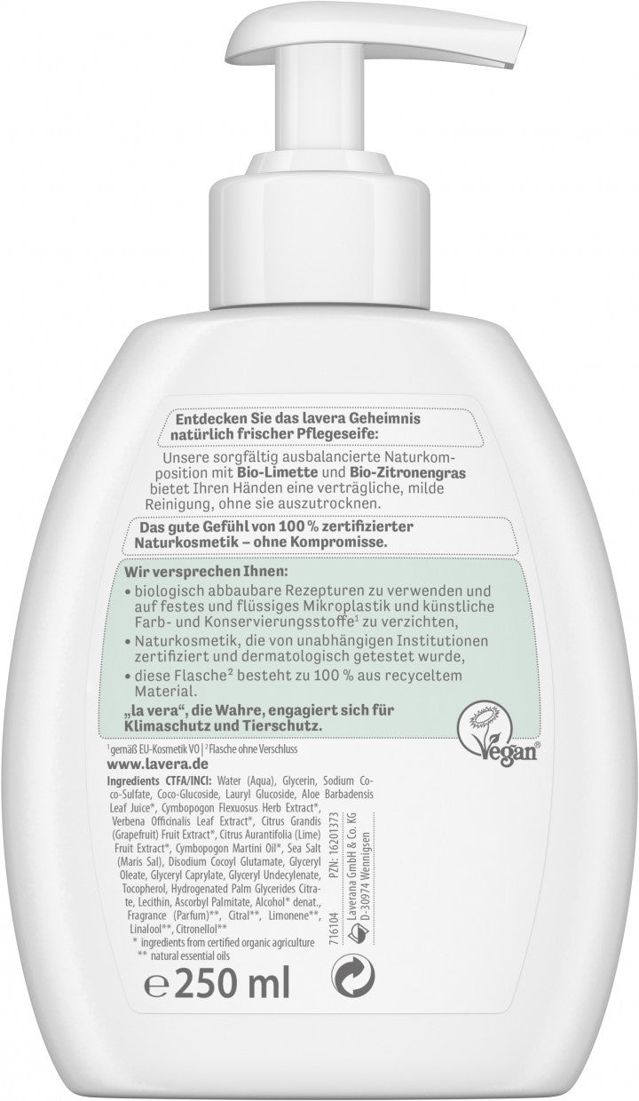 Compoziția naturală echilibrată cu atenție cu lime Bio și lemongrass Bio oferă mâinilor o curățare plăcută, blândă, fără a le usca.