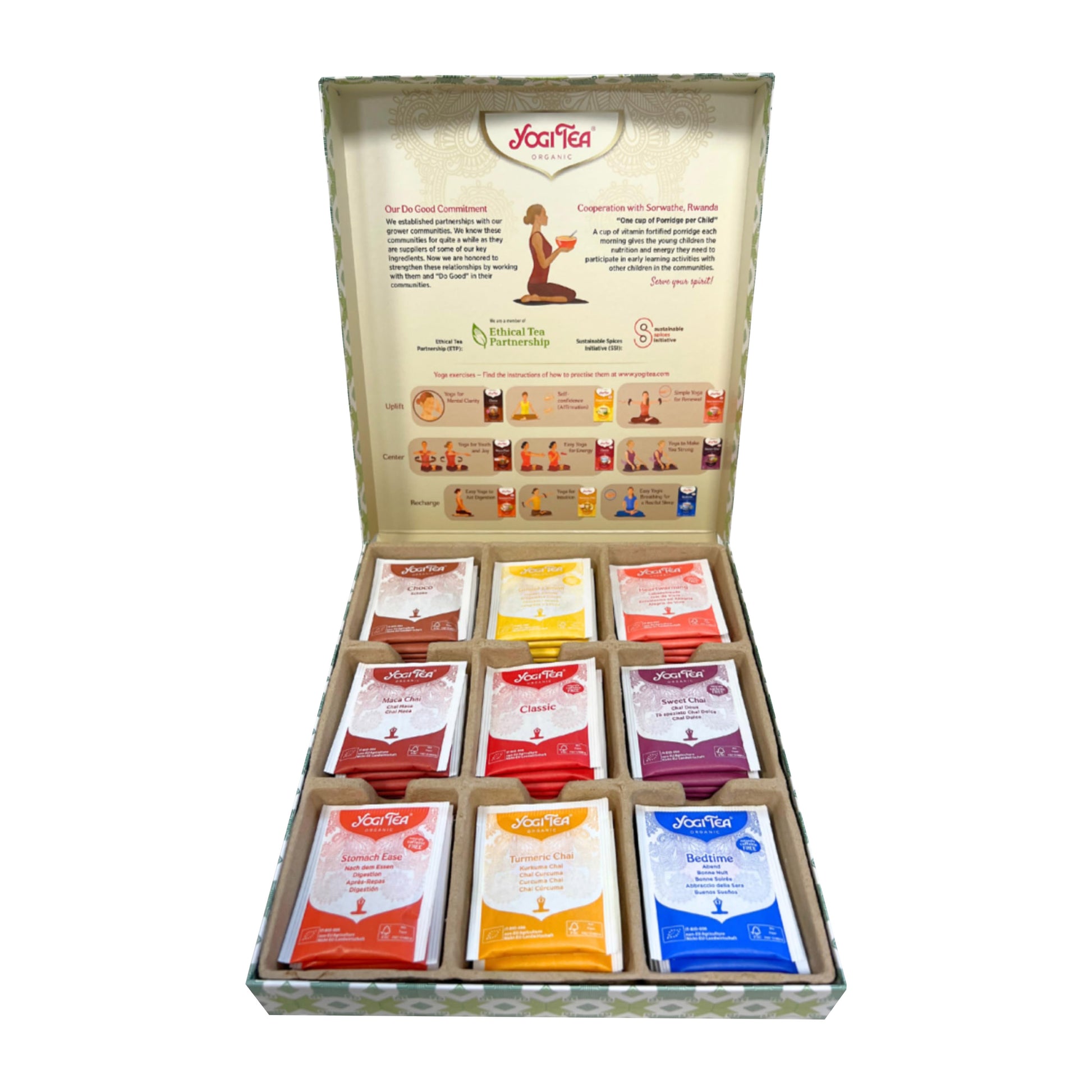 Această cutie conține o selecție de 9 ceaiuri îndrăgite de la Yogi Tea. Din fiecare tip de ceai selectat, există 5 pliculețe.