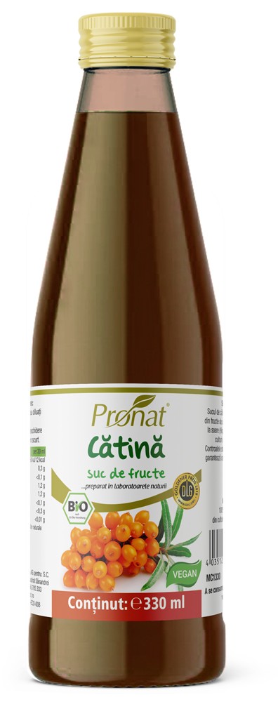 Sucul Bio de cătină se obţine din fructe sănătoase şi bine coapte de cătină (Hipophae Rhamnoides), obţinute din culturi biologice controlate. Controlul strict şi o prelucrare atentă garantează înalta calitate a sucului natural de cătină.