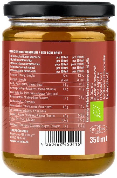 Ingrediente: apă, oase de vită* (29%), ceapă*, roșii*, morcovi*, țelină*, praz*, sare, pastă de tomate*, oțet de mere*, pătrunjel*, piper*, frunze de dafin*, cimbru*.