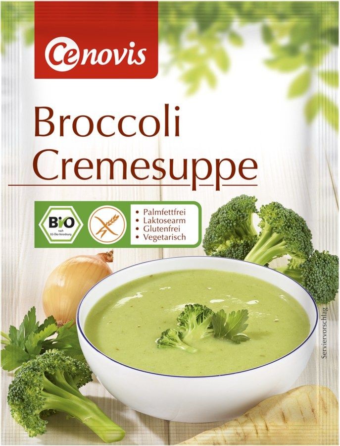 Ingrediente: Pudră de lapte degresat cu conținut redus de lactoză*, făină de orez*, amidon*, sare de mare, 8% broccoli*, extract de drojdie, maltodextrină*, 1,8% păstârnac*, 1,3% ceapă*, agent de îngroșare (făină de semințe de roșcova), ulei de floarea-soarelui, pătrunjel*, curcuma*, frunze de țelină*, flori de nucșoară*, scorțișoară*.