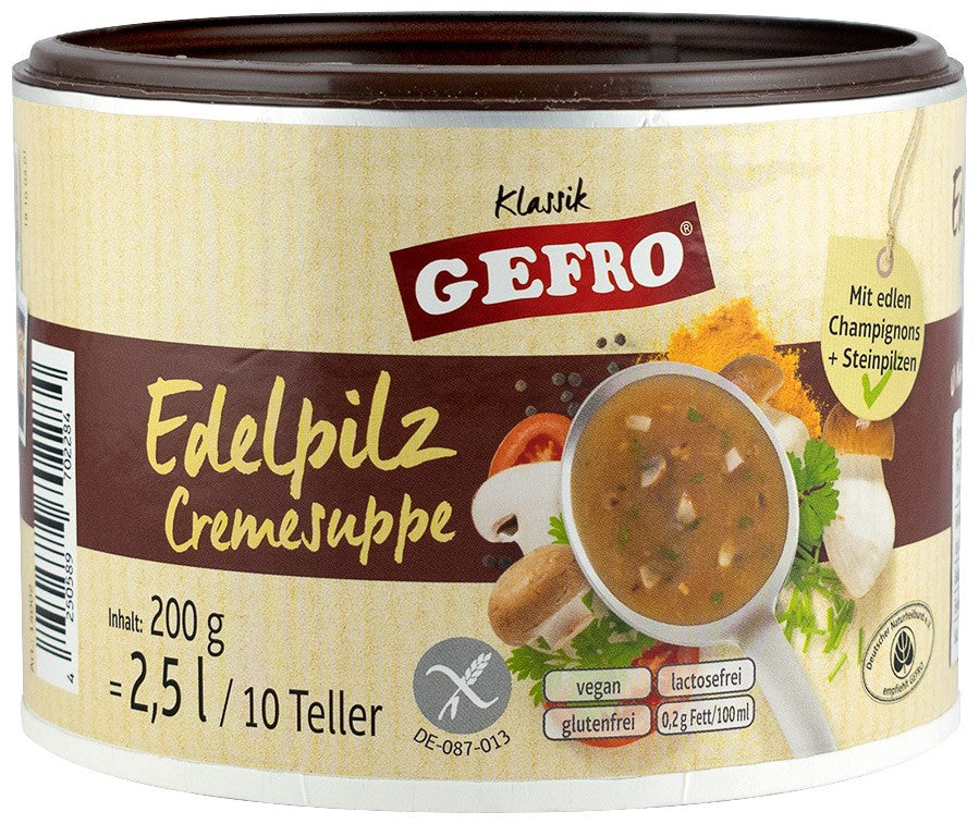 Ingrediente: făină de orez, dextroză, sare de mare, potențiator de aromă: glutamat monosodic*, ciuperci (porcini, ciuperci Champignon), bulion de legume granulate (condiment (conține soia), ulei de palmier, sare), maltodextrină, concentrat din suc de ciuperci, ulei de palmier, pudră de ceapă, pătrunjel, roșii pulbere, arpagic, chervil, ardei, acidifiant: acid citric, turmeric, condimente (conține țelină).