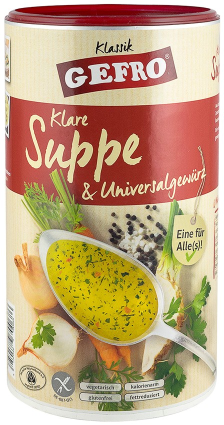 Ingrediente: sare de mare, supă de legume granulate (sare, condimente vegetale, (conține soia), ulei de palmier), lactoză, zahăr, potențiator de aromă: glutamat monosodic*, ulei de palmier, ceapă pudră, condimente, ierburi, morcovi, caramel, extracte de condimente, țelină.