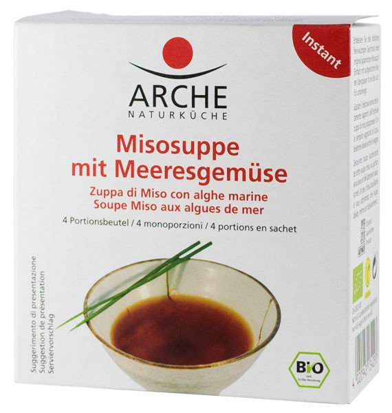 Ingrediente: Miso de orez* (65%) (condiment pastă*: boabe de soia*, orez* maro (33%), sare de mare, apă, Aspergillus oryzae), apă, mirin* (sos de Charles*: orez*, apă, Aspergillus oryzae), shoyu* (sos de soia*: apă, boabe de soia* (19%), grâu*, sare de mare, Aspergillus oryzae), sare de mare, alge wakame (1%), alge kombu (0,3%).