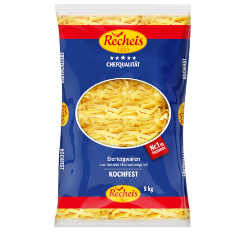 Bine de știut:Ouăle conținute în pastele Recheis asigură o stabilitate excelentă la fierbere și oferă pastelor o culoare galben-aurie apetisantă. Reîncălzirea pastelor:Pastele fierte mai puțin pot fi reîncălzite fie prin opărire scurtă cu apă clocotită într-o strecurătoare, fie prin fierbere timp de 1–2 minute în apă sărată, clocotită. După aceea, se scurg bine și se pot amesteca opțional cu unt sau ulei.