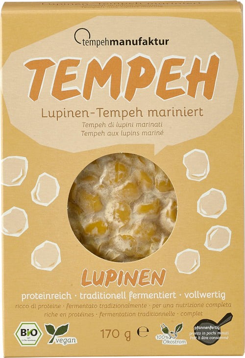 Ingrediente: lupin* (lupin* 50%, apă), sos de lupin* 20,6% (apă, lupin*, sare de mare), culturi starter (Rhizopus).