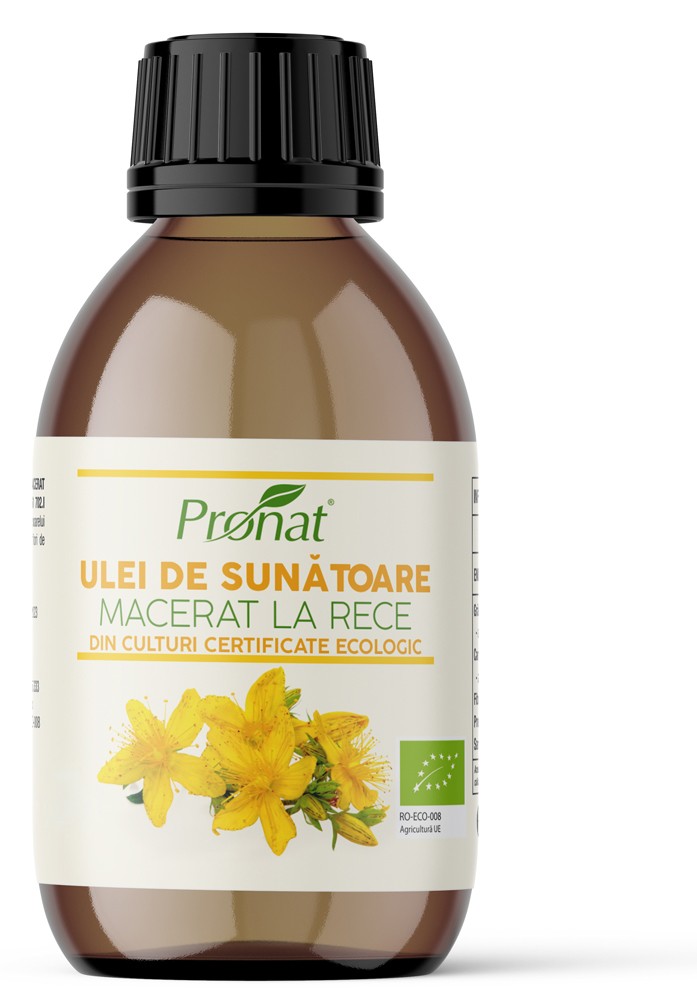 Produs ecologic obținut din părți aeriene de sunătoare (Hypericum perforatum), ale căror substanţe active au fost extrase în ulei de floarea soarelui presat la rece.
