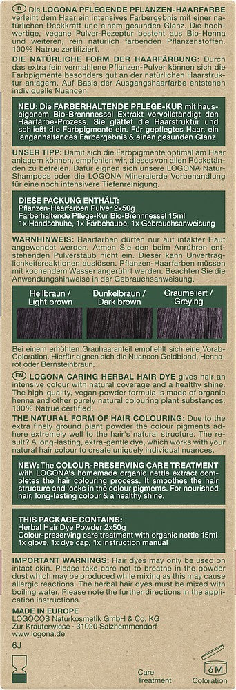 Pudra de păr din plante de culoare maro inchis este potrivită în special pentru părul sateninchis, saten deschis si carunt. Culorile de păr pe bază de plante Logona sunt deosebit de blânde și vă colorează părul mai blând decât culorile chimice. Ele nu atacă direct structura părului, ci înfășoară părul pentru a-l proteja. Rezultatul culorii poate varia individual în funcție de culoarea originală a părului. Fiecare culoare de păr din plante folosește o rețetă făcută din Henna, ierburi și fructe pentru luminozitate intensă, mai multă strălucire și volum natural. Culoarea părului pe bază de plante poate fi folosită imediat și este potrivită și pentru vopsirea rădăcinilor.