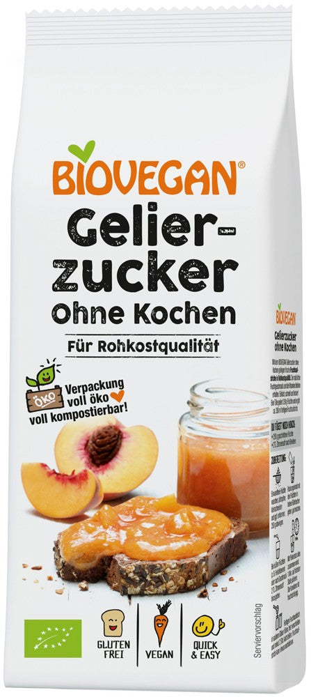 Cu zaharul gelifiant BIOVEGAN fără gătit, obțineți gemuri de fructe proaspete în calitatea alimentelor crude. Gustul natural de fructe și vitaminele sunt păstrate. Simplu, rapid și gustos! Un plic este suficient pentru 250 g de fructe din care rezultă aprox. 350 ml de produs finit.